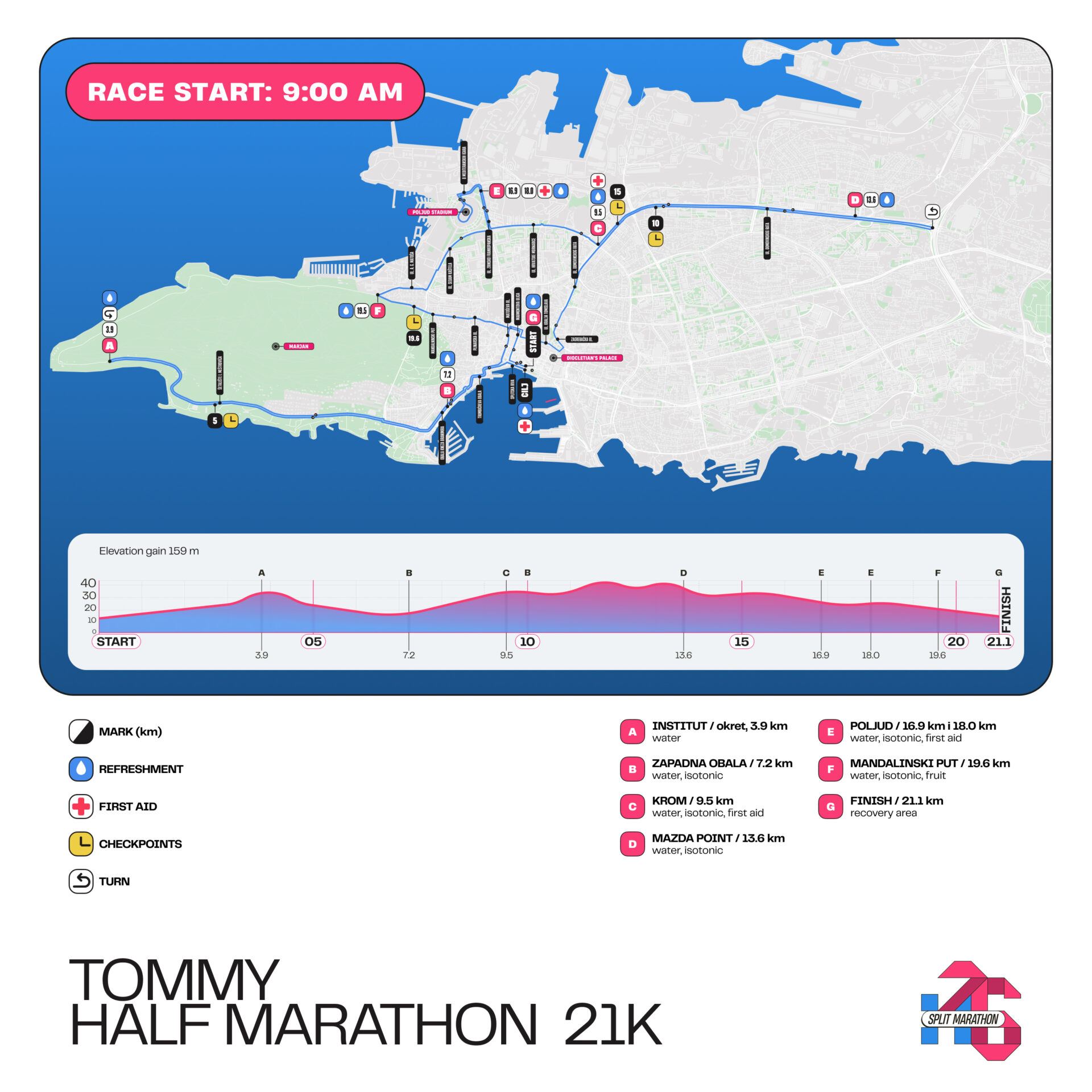 21 km – RIVA START – Obala Hrvatskog narodnog preporoda – Trumbićeva obala I-Z – Obala kneza Branimira I-Z – Šetalište Ivana Meštrovića I-Z – OKRET Institut – Šetalište Ivana Meštrovića Z-I – Obala kneza Branimira Z-I – Trumbićeva obala Z-I – Trg Franje Tuđmana – Bana Jelačića – Matošićeva ulica – Teutina ulica Marmontova ulica – Ulica Kralja Tomislava – Zagrebačka ulica – Manuška poljana – Livanjska – Domovinskog rata Z-I – OKRET na kraju Domovinskog rata – Domovinskog rata I-Z – Ulica Hrvatske mornarice – Zrinsko Frankopanska J-S – Osmih mediteranskih igara – Stadion Poljud – Osmih mediteranskih igara – Zrinsko Frankopanska S-J – Ulica Sedam Kaštela – Ulica Antuna Gustava Matoša – Mandalinski put – Plinarska ulica – Teutina ulica – Marmontova ulica – Obala Hrvatskog narodnog preporoda – RIVA FINISH