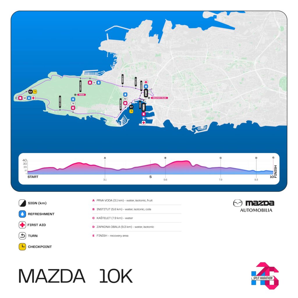 10 km – RIVA START – Obala Hrvatskog narodnog preporoda – Marmontova – Ulica Kralja Tomislava – Zagrebačka – Sinjska – Teutina – Plinarska – Mandalinski put – Šetalište Marina Tartaglie – Šetalište Ivana Meštrovića – Obala kneza Branimira – Obala Hrvatskog narodnog preporoda – RIVA FINISH