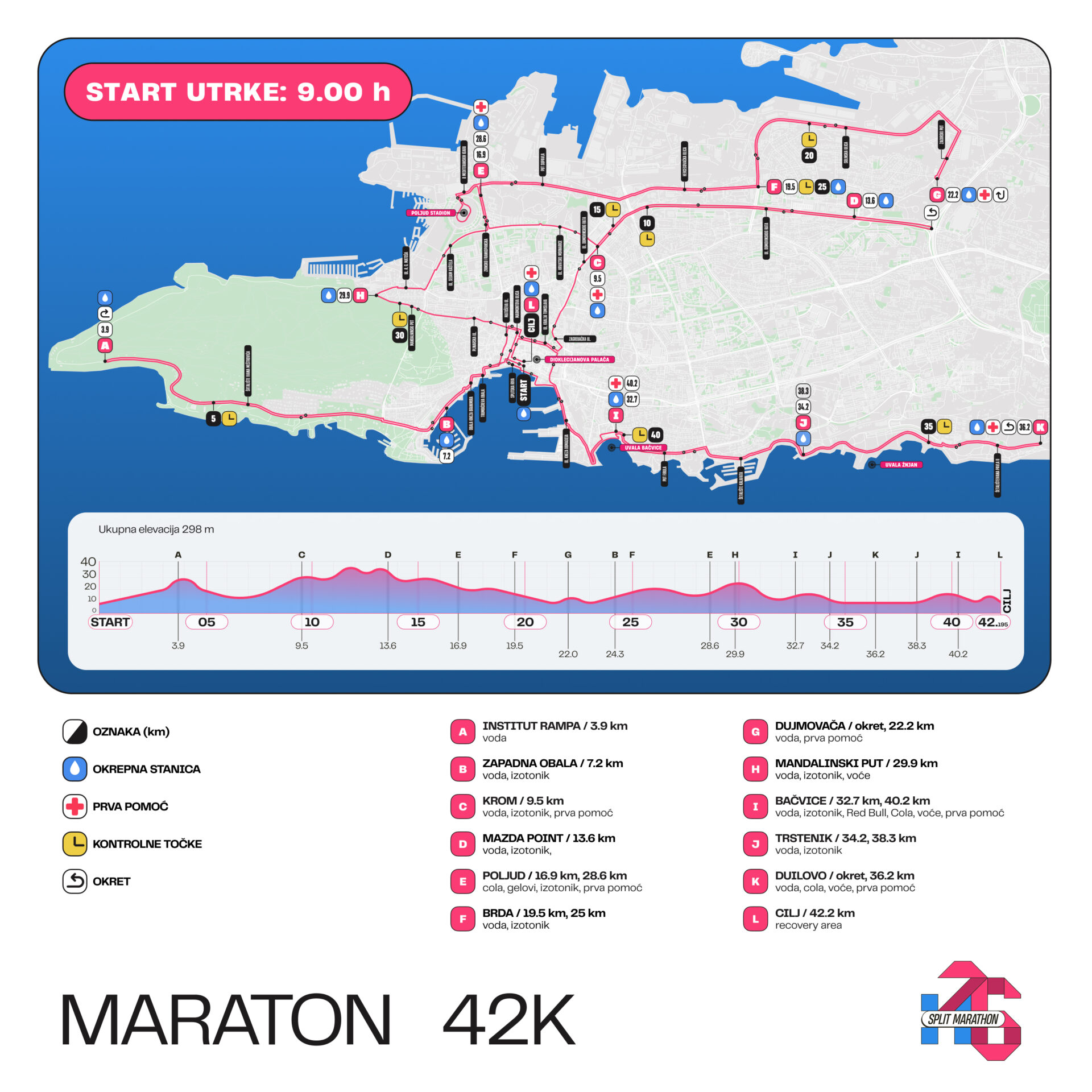 42 km – RIVA START – Obala Hrvatskog narodnog preporoda – Trumbićeva obala I-Z – Obala kneza Branimira I-Z – Šetalište Ivana Meštrovića I-Z – OKRET Institut – Šetalište Ivana Meštrovića Z-I – Obala kneza Branimir Z-I, Trumbićeva obala Z-I – Trg Franje Tuđmana – Ulica Bana Jelačića – Matošićeva ulica – Teutina ulica – Marmontova ulica S-J – Ulica Kralja Tomislava Z-I– Zagrebačka ulica – Manuška poljana – Livanjska – Domovinskog rata Z-I – OKRET na kraju Domovinskog rata – Domovinskog rata I-Z – Ulica Hrvatske mornarice – Zrinsko Frankopanska – Put Supavla Z-I – Hercegovačka Z-I – Solinska Z-I – Put Mostina Z-I – Zagorski put S-J – OKRET Zagorski put – Put Mostina I-Z – Solinska I-Z – Hercegovačka I-Z – Put Supavla I-Z – Osmih mediteranskih igara – Stadion Poljud – Osmih mediteranskih igara – Zrinsko Frankopanska – Ulica Sedam Kaštela – Ulica Antuna Gustava Matoša – Mandalinski put – Plinarska ulica – Teutina – Marmontova S-J- Obala Hrvatskog narodnog preporoda – Domagojeva obala Z-I – Put Vlaka Z-I – Plaža Bačvice – Šetalište Petra Preradovića Z-I – Put Firula Z-I – Spinčićeva ulica S-J – Šetalište Kalafata Z-I – Šetalište Pape Ivana Pavla II Z-I – Šetnica plaža Žnjan Z-I – Okret plaža Duilovo – Šetnica plaža Žnjan I-Z – Šetalište Pape Ivana Pavla II I-Z – Šetalište Kalafata I-Z – Spinčićeva ulica J-S – Put Firula I-Z – Šetalište Petra Preradovića I-Z – Plaža Bačvice – Put Vlaka I-Z – Domagojeva obala I-Z – Hrvojeva – Ulica Kralja Tomislava I-Z – Marmontova S-J – Obala Hrvatskog narodnog preporoda – RIVA CILJ